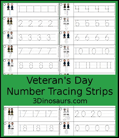 Veteran's Day Number Tracing Strip Printable contains 8 pages: