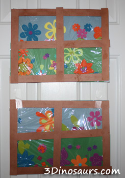 What you need: blue construction paper, 3 short and long strips of brown construction paper, half a piece of green construction paper with small lines for cutting at the top, glue stick, Elmer’s glue, plastic wrap, scissors, foam flowers.
