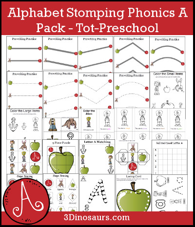 The Alphabet Stomping Phonics Tot-Preschool Pack has 30 pages of printables plus an index to help you find the pages.