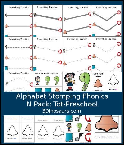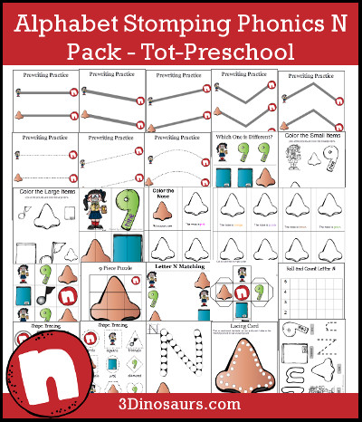 Prewriting Solid Line, Prewriting Dashed Line, Which is Different, Color the Small Items, Color the Large Items, 2 Piece Puzzles, Color the Nose Book, Matching Cards, 9 Piece Puzzle, Single Page Matching, Roll & Count Letter N, Shape Tracing, Dot the Letter N, Lacing Card, Letter N Coloring Page
