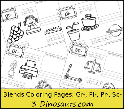 Blends Coloring Pages: Gr-, Pl-, Pr-, Sc- contains 4 pages: