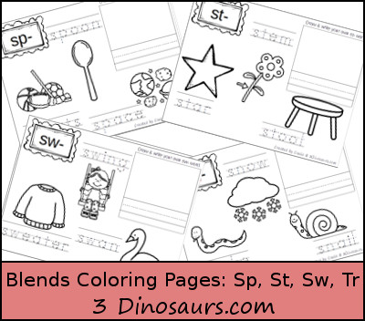 Blends Coloring Pages: Sp-, St-, Sw-, Tr- contains 4 pages: