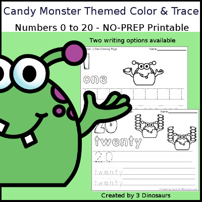 Candy Monster Themed Number Color & Trace contains 43 pages: