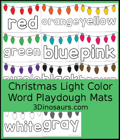 Christmas Lights Color Word Playdough Mat Printable contains 11 pages: