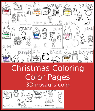 Here are the Christmas Themed Color Coloring pages. The color words are red, orange, yellow, green, blue, purple, pink, black, brown, white and gray