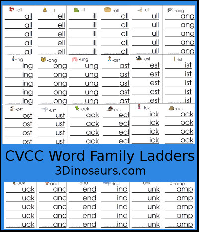 - CVCC Words families: all, -ill, -ell, -ull, -ing, -ang, -ung, -ong, -ast, -ist, -ust, -ost, -est, -ack, -ick, -ock, -uck, -and, -end, -ind, -ond, -und, ink, -unk, -onk, -amp, -imp, -ump