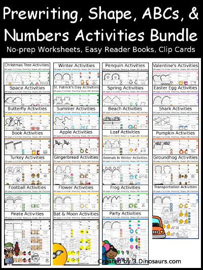 Themed Activities Pack with Prewriting, Shapes, ABCs, and Numbers Bundle contains 5903 pages: