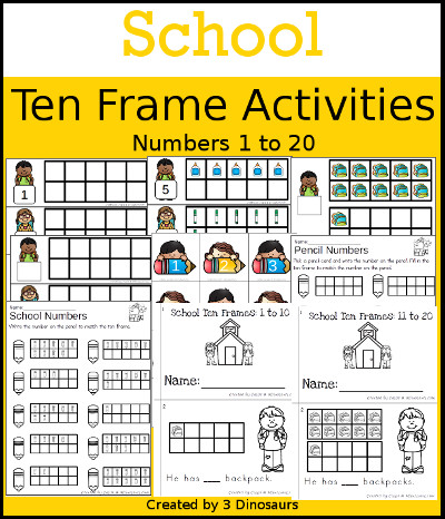 - School Themed Ten Frame Cards with the filled out number and Ten Frames with numbers 1 to 20