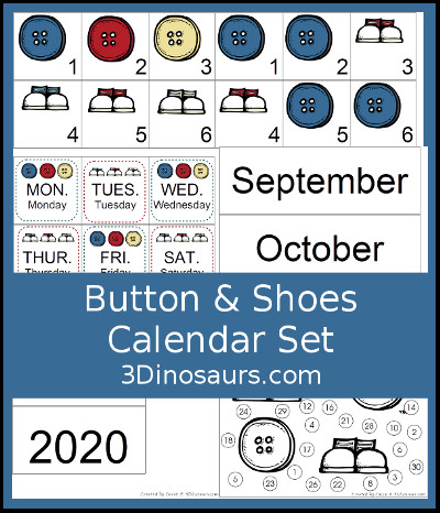- Button & Shoes Calendar Set: Days of the weeks, September, October, 2019, 2020, 2021 and 1 to 31 numbers (3×3).