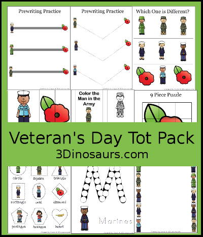 (Part 1) 3 Part Cards Veteran's Words, Which One Is Different, What Comes Next?, Prewriting Practice, Prewriting Practice Patterns, Patterns Cards, Matching Cards, 4 Piece Puzzles, 10 Piece Puzzles (1-10, 11-20, 21-30, 31-40, 41-50), Army Color by Size, Counting & Graph, Trace the Letter Print (A, M, N, C, P), (Part 2) Beginning Sounds, Pocket Chart Cards, Trace beginning sound, Trace the Word, Write the Word, Write a Sentence, Trace & Color, Describe the soldiers, Acrostic Poems, Our Soldiers Easy Reader Book, Our Soldiers Easy Reader Book with Tracing