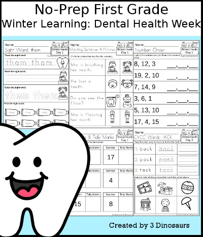 Winter Learning: First Grade Dental Health Weekly Pack contains 22 pages: